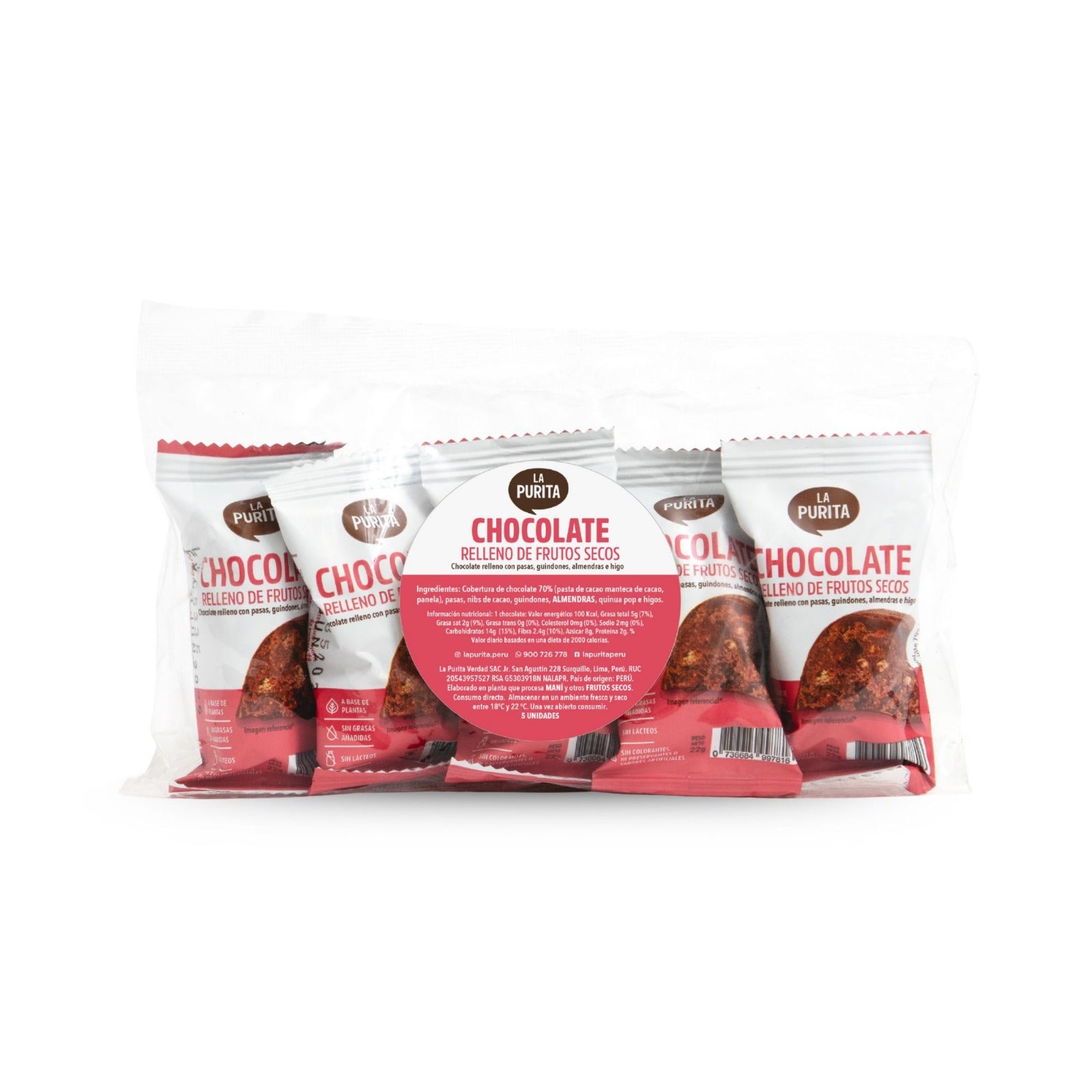 ¡Disfruta de un deleite gourmet con nuestros Chocolates Rellenos de Frutos Secos! Este pack de 5 unidades ofrece una exquisita combinación de sabores y texturas, con pasas, guindones, almendras, nibs de cacao, quinua pop y higos, todo envuelto en una cobertura orgánica de chocolate al 70%. Un placer indulgente y saludable para cualquier momento del día.